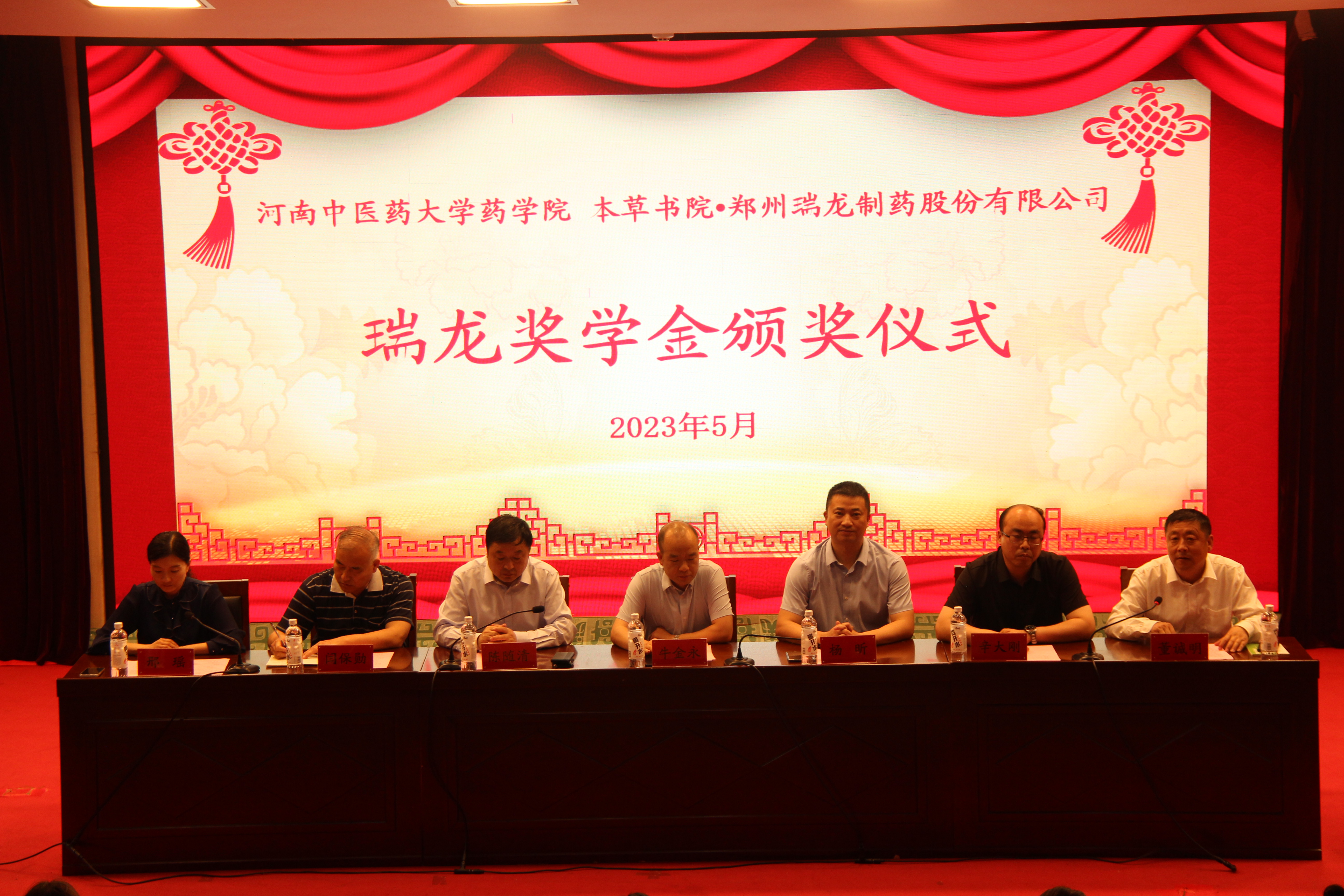 5月31日,河南中醫(yī)藥大學(xué)舉行2022年度“瑞龍獎(jiǎng)學(xué)金”頒獎(jiǎng)典禮,河南中醫(yī)藥大學(xué)藥學(xué)院黨委書記楊昕、藥學(xué)院院長(zhǎng)陳隨清、藥學(xué)院副院長(zhǎng)董誠明、本草書院副院長(zhǎng)邢瑤以及師生代表出席本次典禮。鄭州瑞龍制藥股份有限公司(以下簡(jiǎn)稱“瑞龍制藥”)總經(jīng)理牛金永、副總經(jīng)理辛大剛、總工程師閆保勛受邀出席活動(dòng)。